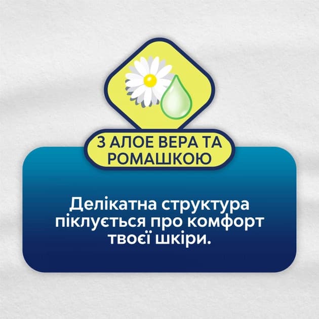 Гігієнічні прокладки Libresse Natural Care Regular+ мають м'яку поверхню як "бавовна" і підходять для чутливої шкіри. Збагачені натуральними екстрактами алое вера і ромашки, які делікатно доглядають за шкірою в інтимній зоні. Анатомічна форма прокладки повторює контури тіла, забезпечуючи комфорт і захист від протікань.
