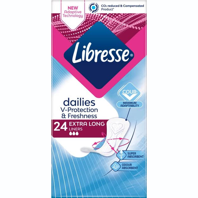 Щоденні прокладки Libresse Dailies V-Protection&Freshness Extra Long вбирають незначні виділення, зберігаючи шкіру та білизну сухими. Дихаючий верхній шар дозволяє шкірі дихати. А спеціальна гнучка форма Cour-V щільно прилягає до тіла. Ці прокладки відрізняються своїм розміром, так як на 4,2 см довші за звичайні.